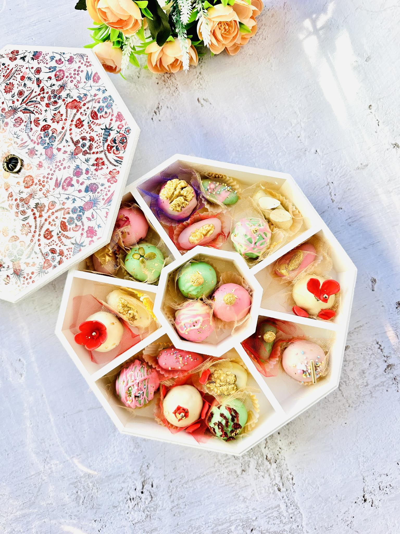 📦 Ambalaža: Svaki bombonjer dolazi upakovan u elegantnu crnu kutiju na čijoj sredini se nalazi mali otvor u obliku kruga kroz koji se nazire dezen ćilima i čini otvaranje poklona još uzbudljivijim.