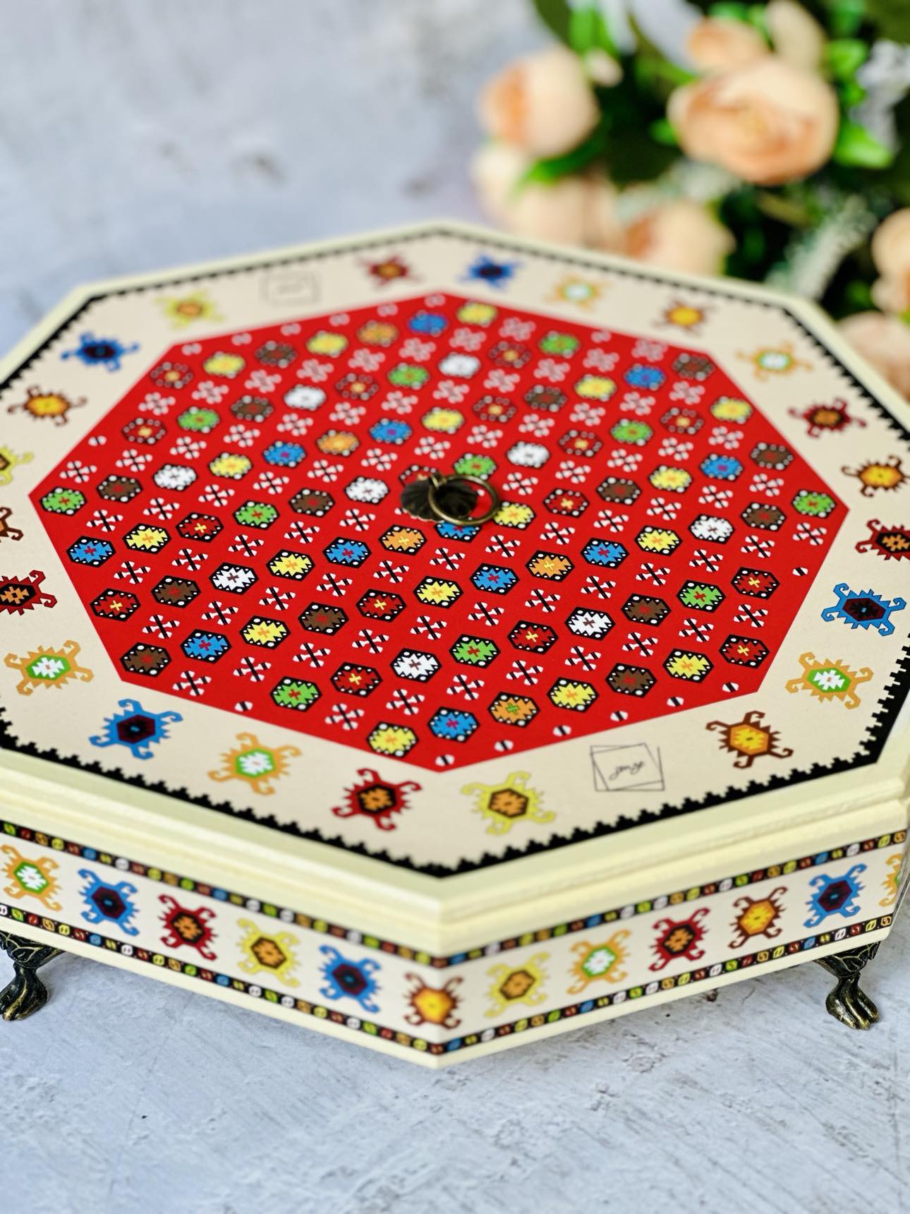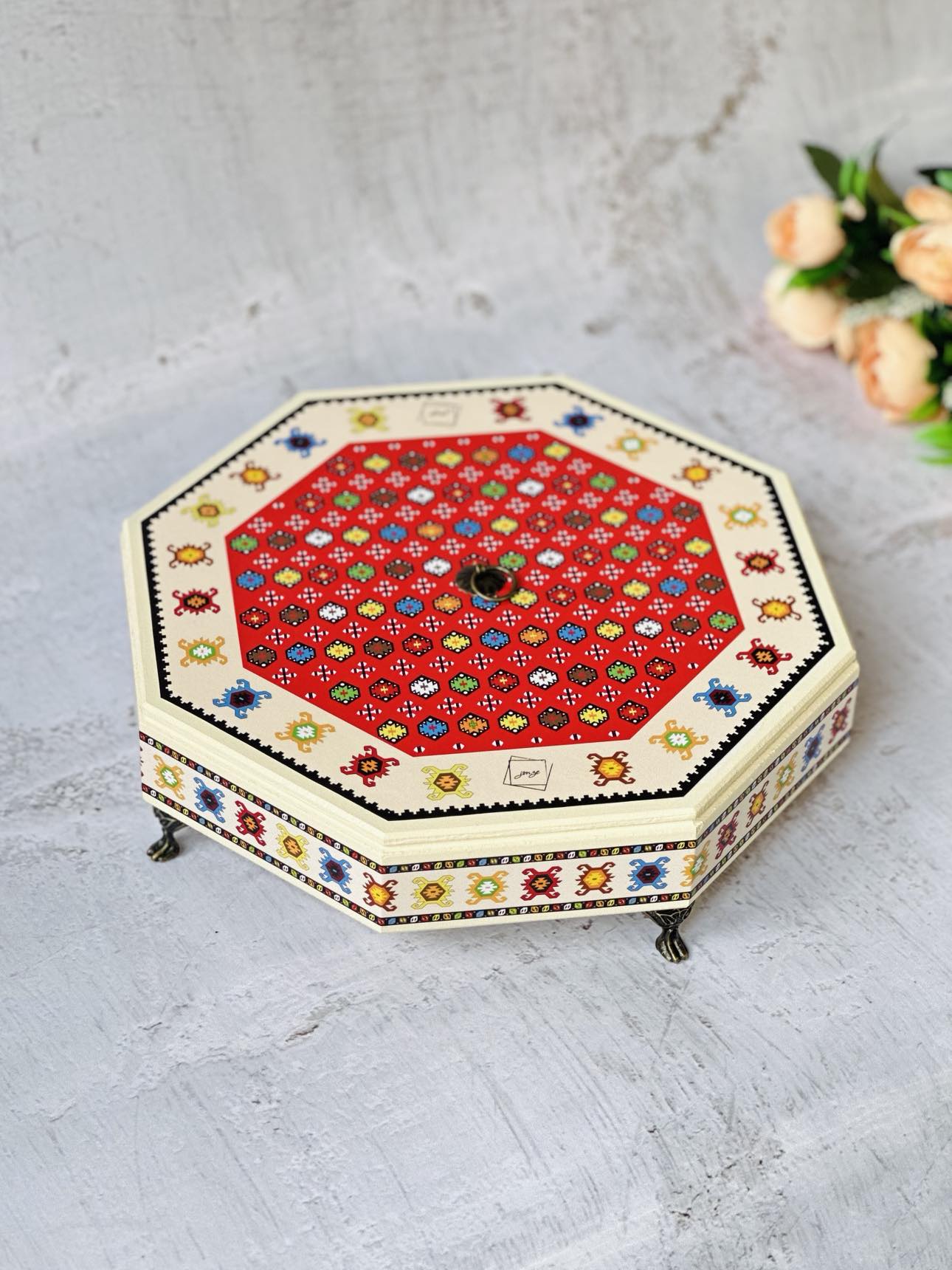 📦 Ambalaža: Svaki bombonjer dolazi upakovan u elegantnu crnu kutiju na čijoj sredini se nalazi mali otvor u obliku kruga kroz koji se nazire dezen ćilima i čini otvaranje poklona još uzbudljivijim.