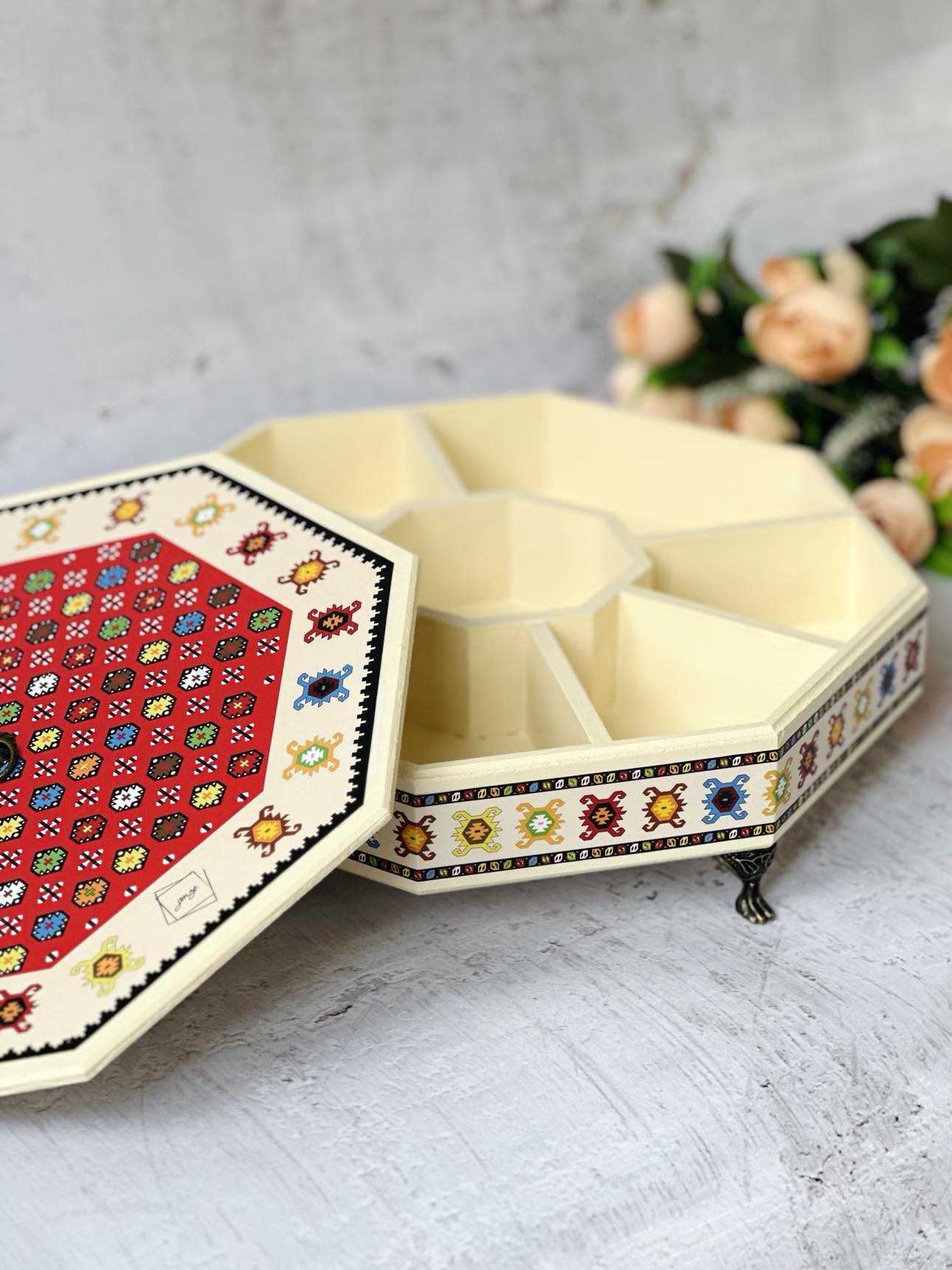 🗂️ Organizer: Ovaj bombonjer učiniti će vaš sto elegantnijim i bogatijim. Njegove razdjelne pregrade omogućavaju vam da organizujete različite poslastice ili sitnice, dok mu poklopac čijem smo dizajnu posvetili posebnu pažnju pruža zaštitu od prašine i ostalih vanjskih uticaja.