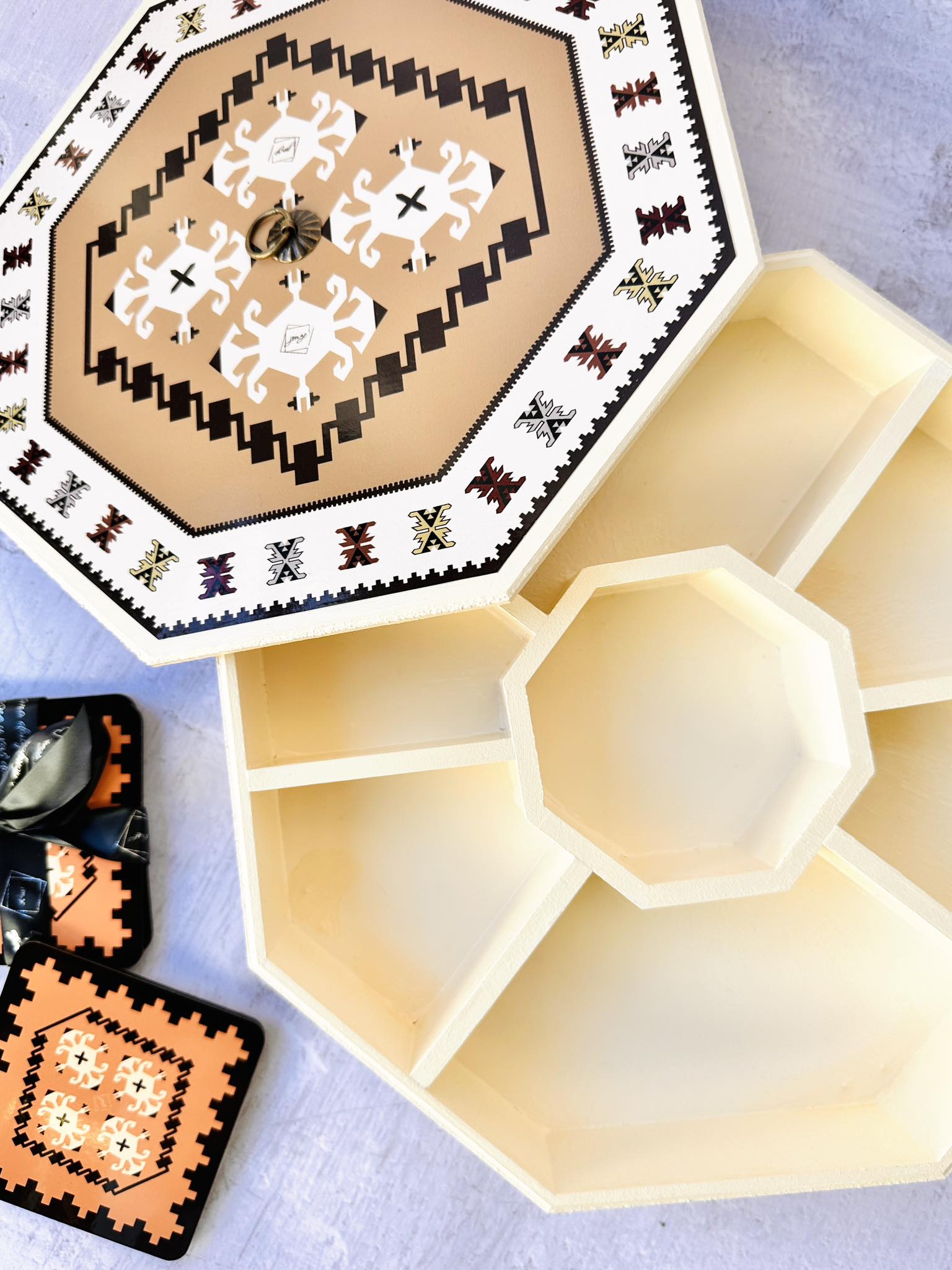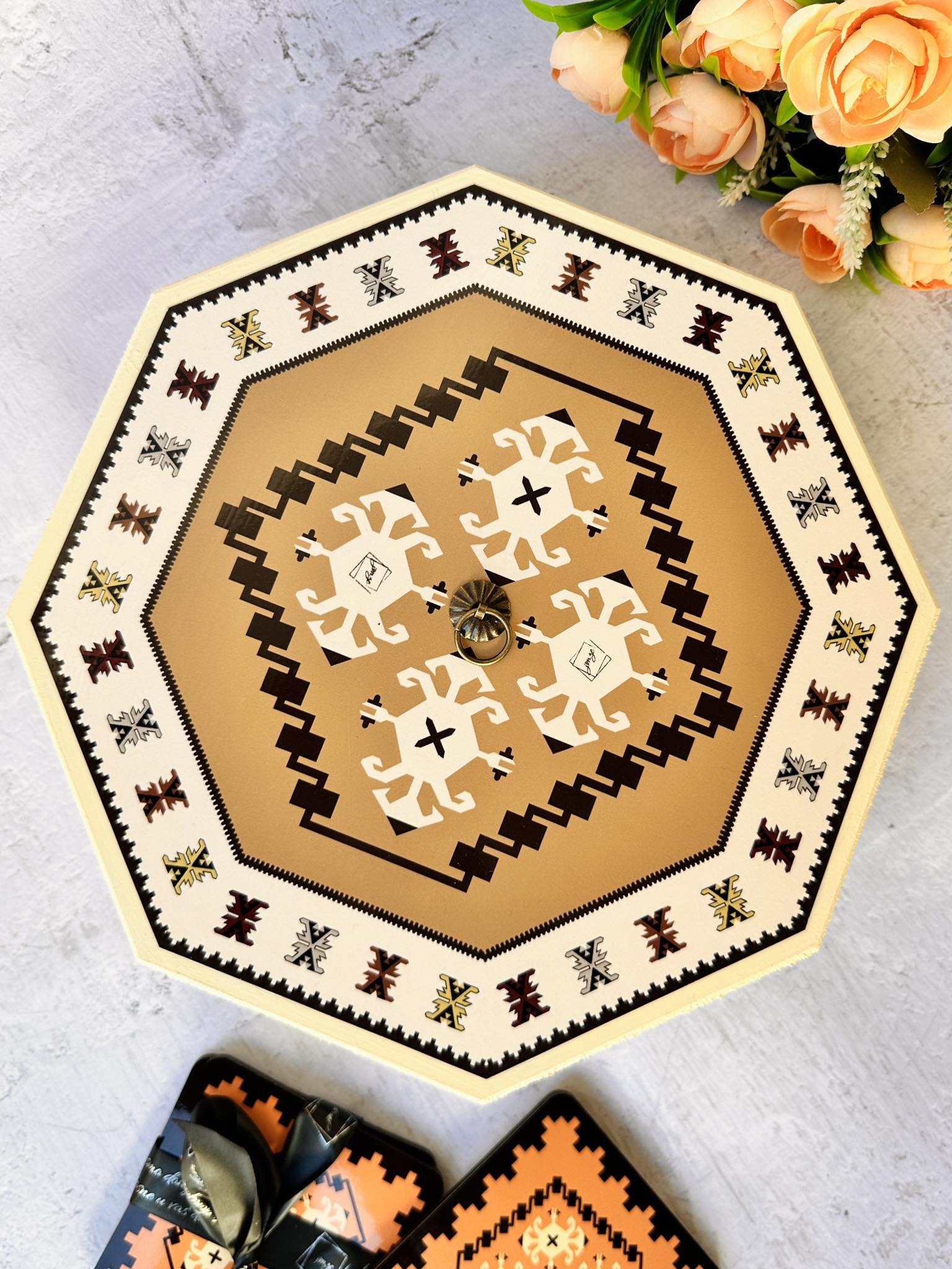 📦 Ambalaža: Svaki bombonjer dolazi upakovan u elegantnu crnu kutiju na čijoj sredini se nalazi mali otvor u obliku kruga kroz koji se nazire dezen ćilima i čini otvaranje poklona još uzbudljivijim.