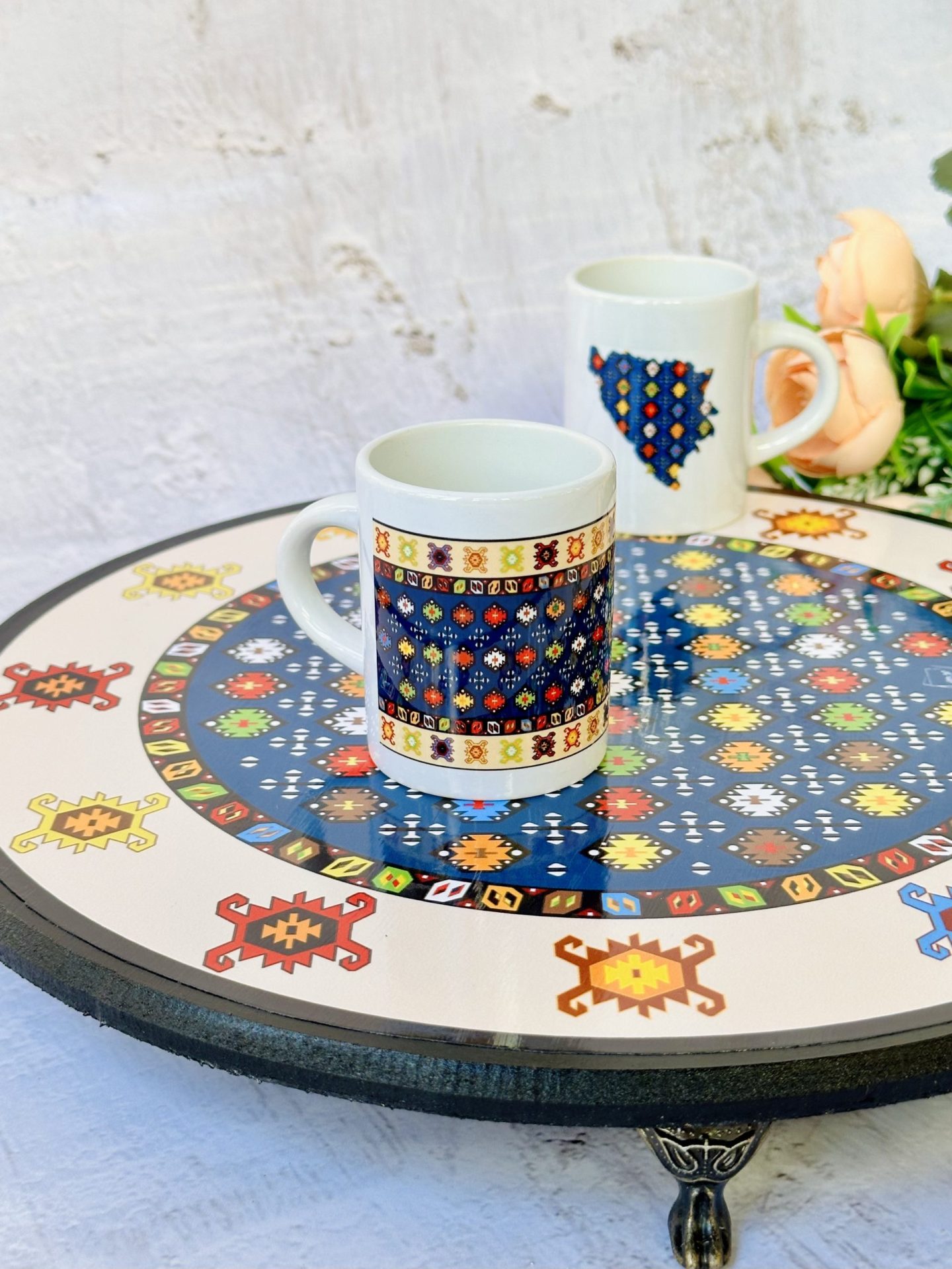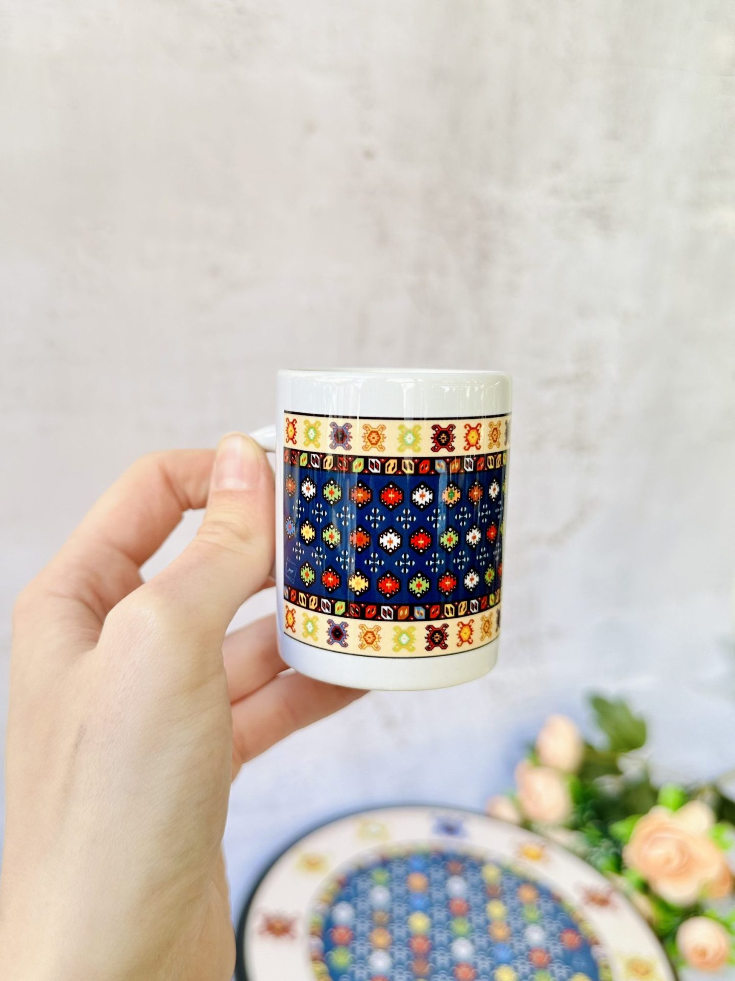 Nijansa plave boje na šoljici Sarajlija simbol je dubine, povjerenja, odanosti i stabilnosti. Prošarana je brojnim motivima “bombica” jarkih boja po kojima se prepoznaju svi balkanski ćilimi, a u kojima se nalaze mali krstići. 🐳🫂🫐 Krst kao motiv na bosanskom ćilimu simbolizirao je duhovnost, vjeru i zaštitu od zla, kao i ravnotežu. ✝️ Kornjače su najčešći motivi na bosanskim ćilimima, a prisutni su u nizovima na vrhu i dnu šolje. Simbolizirale su zaštitu, mudrost, napredak, izdržljivost i dugovječnost.🐢Ključne karakteristike: