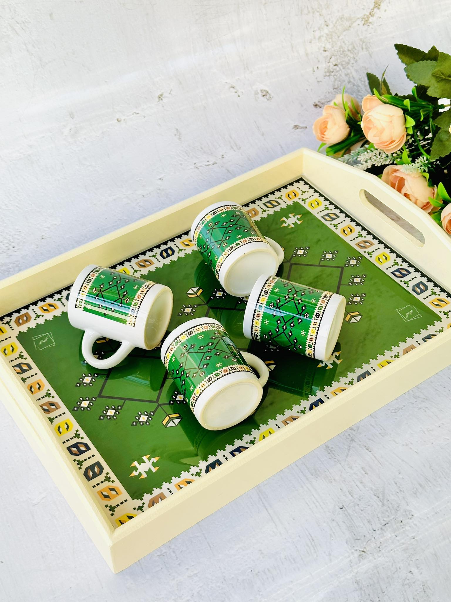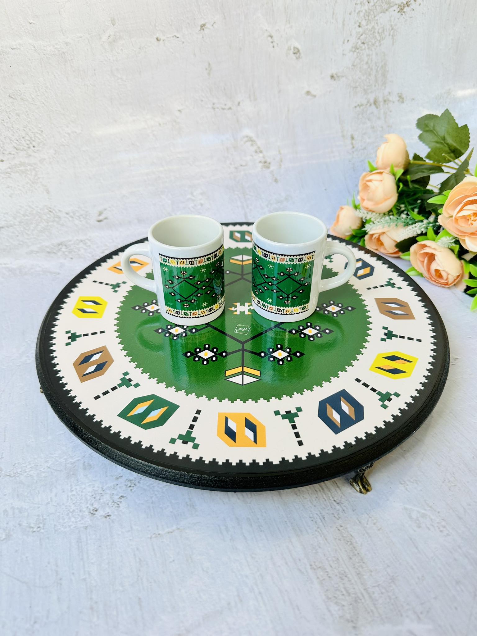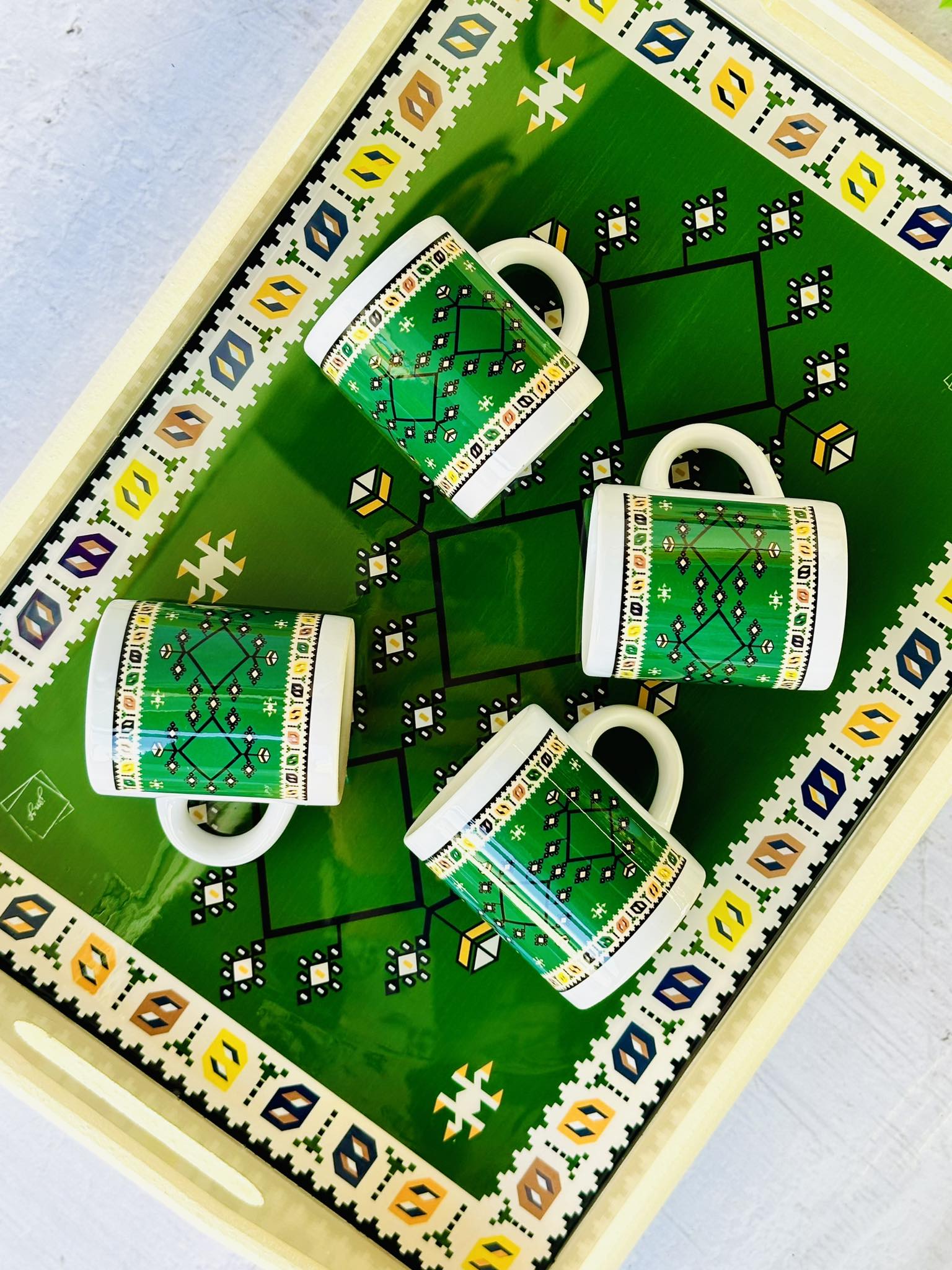 Nijansa zelene boje na šolji Zelengora, odabrana je tako da podsjeća na prirodu, zdravlje, svježinu i bosanska polja i šume, jednom rječju – život. Zelena boja simbol je prosperiteta, balansa, nade i sigurnosti. Često ukazuje na nove početke, napredak i cjelokupno blagostanje. 🍀🌱🍐 Šolja Zelengora ime je dobila po planini Zelengori za koju kažu da je istovremeno i blaga i divlja. Nadaleko je poznata po mnogim izvorima hladne i pitke vode, lijepim jezerima, bogatim životinjskim svijetom te mnoštvom ljekovitog bilja. Kompozicija satkana od linija koje zauzimaju centralni dio ćilima Zelengora simboliziraju red, ravnotežu i harmoniju. Rombovi kojima je okružen centralni dio ćilima povezani su sa tradicijom i historijom bosanskog naroda, a izgledom podsjećaju na štitove. Prisutni su u nizovima, na vrhu i dnu šolje, i simboliziraju zaštitu. 🛡Ključne karakteristike: