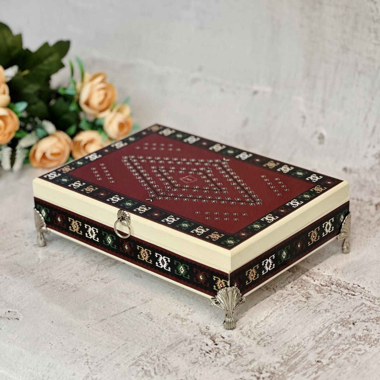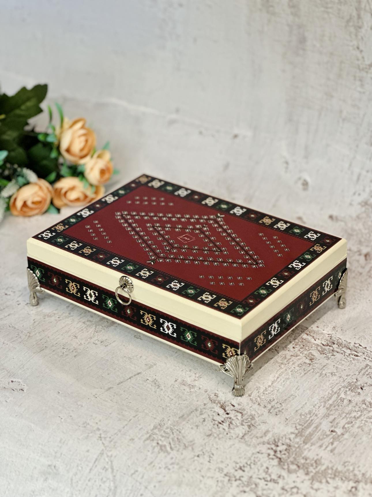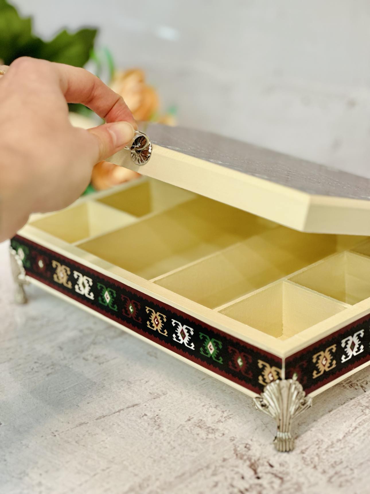 Nijansa bordo boje na kutiji sa motivom petrovačkog ćilima simbol je individualnosti i ambicije. Kompozicija satkana od linija koje zauzimaju centralni dio kutije za nakit simboliziraju red, ravnotežu i harmoniju. Petrovački ćilim obrubljen je kornjačama koje se na šolji nalaze u nizovima, na vrhu i na dnu šolje. Kornjača na bosanskom ćilimu je simbol za dug i sretan život pun progresa. 🐢