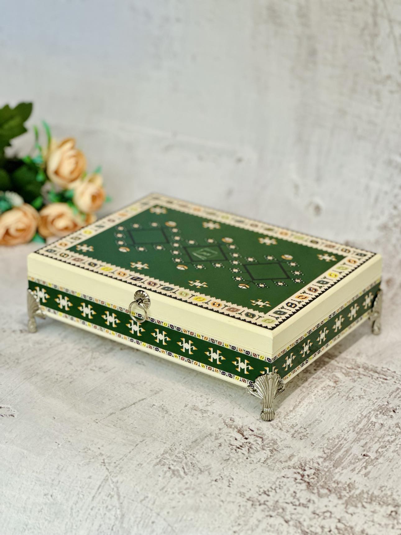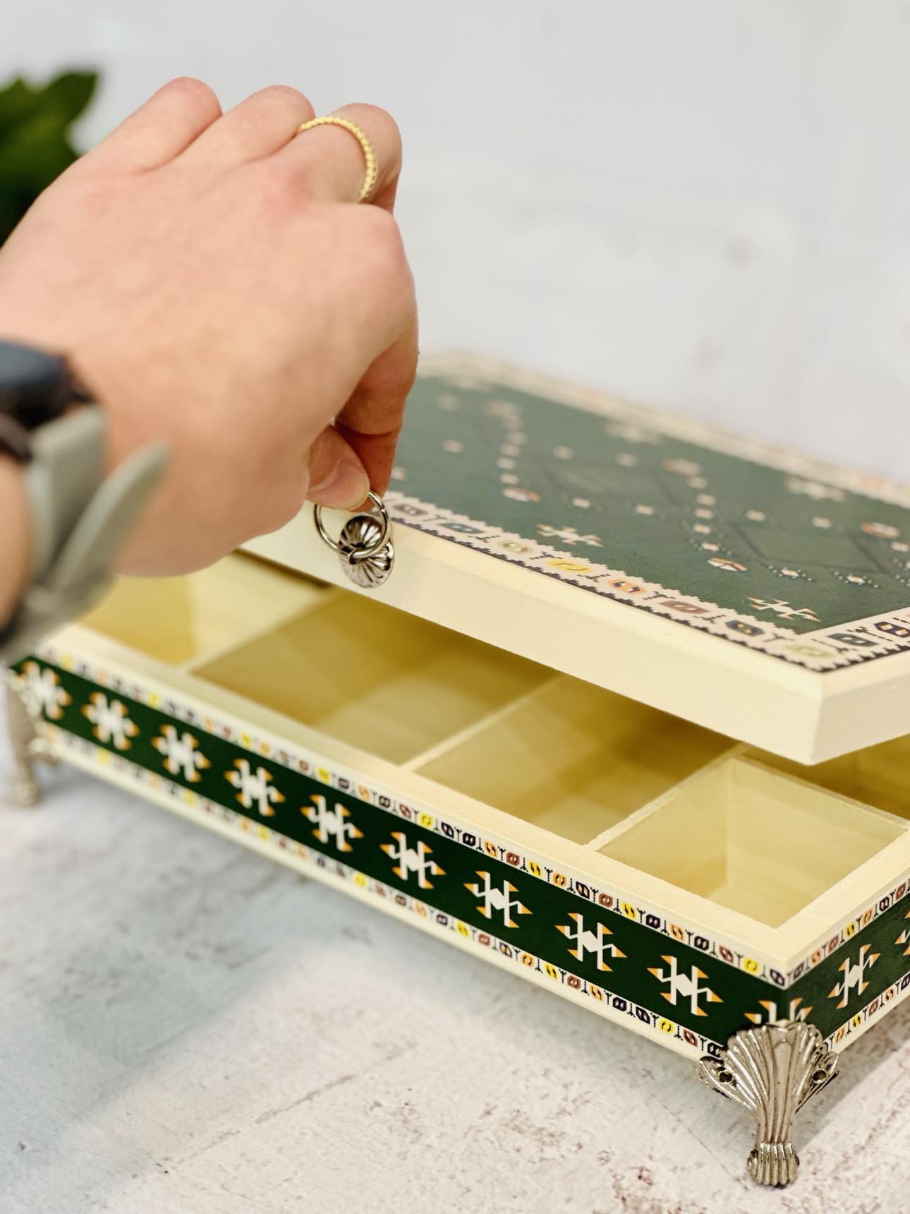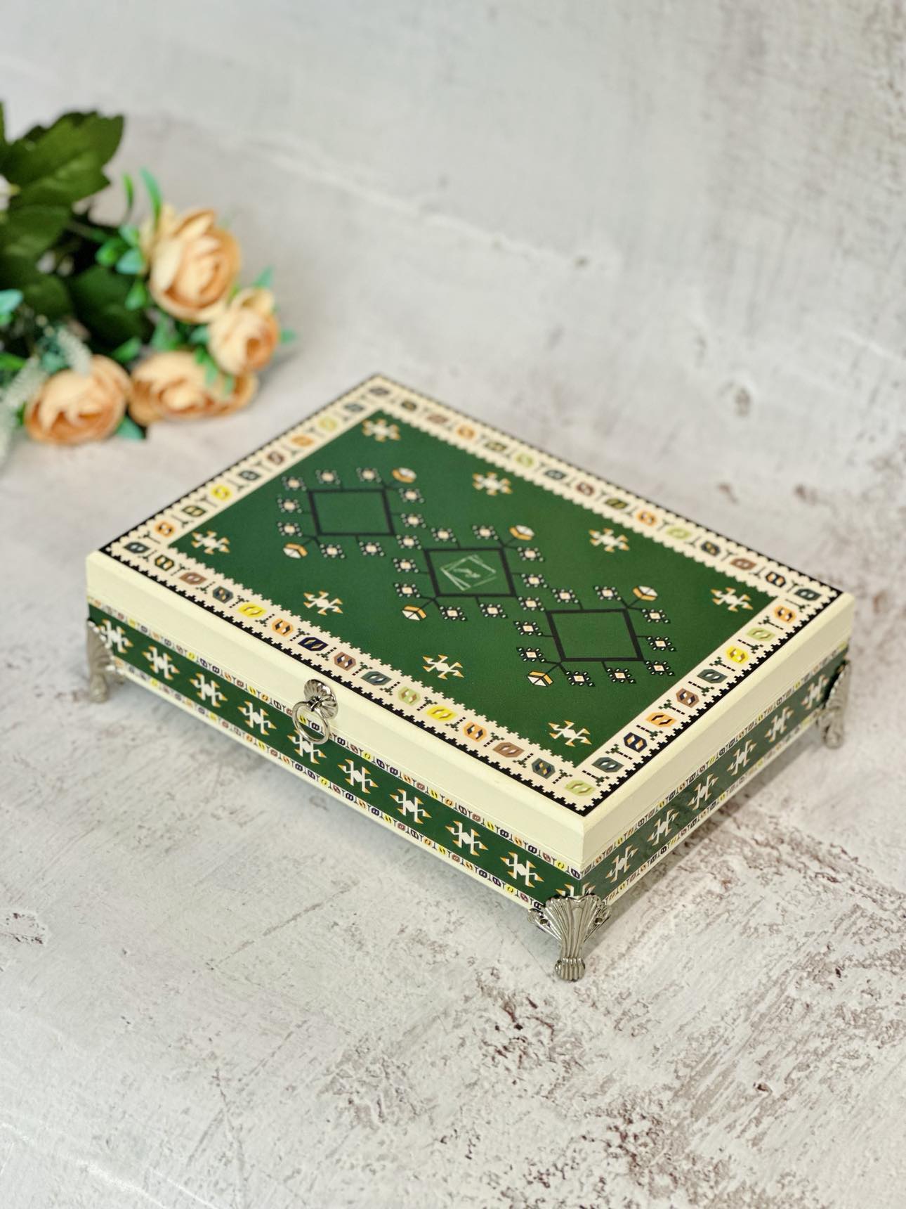 Nijansa zelene boje na Zelengora ćilimu, odabrana je tako da podsjeća na prirodu, zdravlje, svježinu i bosanska polja i šume, jednom rječju – život. Zelena boja simbol je prosperiteta, balansa, nade i sigurnosti. Često ukazuje na nove početke, napredak i cjelokupno blagostanje. 🍀🌱🍐 Kutija za nakit – Zelengora – ime je dobila po planini Zelengori za koju kažu da je istovremeno i blaga i divlja. Nadaleko je poznata po mnogim izvorima hladne i pitke vode, lijepim jezerima, bogatim životinjskim svijetom te mnoštvom ljekovitog bilja. Kompozicija satkana od linija koje zauzimaju centralni dio ćilima Zelengora simboliziraju red, ravnotežu i harmoniju. Rombovi kojima je okružen centralni dio ćilima povezani su sa tradicijom i historijom bosanskog naroda, a izgledom podsjećaju na štitove. Prisutni su u nizovima i simboliziraju zaštitu. 🛡