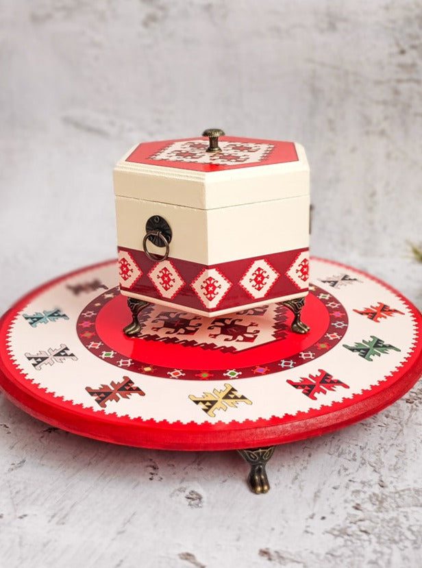 📦 Ambalaža: Svaki šećerluk dolazi upakovan u elegantnu crnu kutiju na čijoj sredini se nalazi mali otvor u obliku kruga kroz koji se nazire dezen ćilima i čini otvaranje poklona još uzbudljivijim.