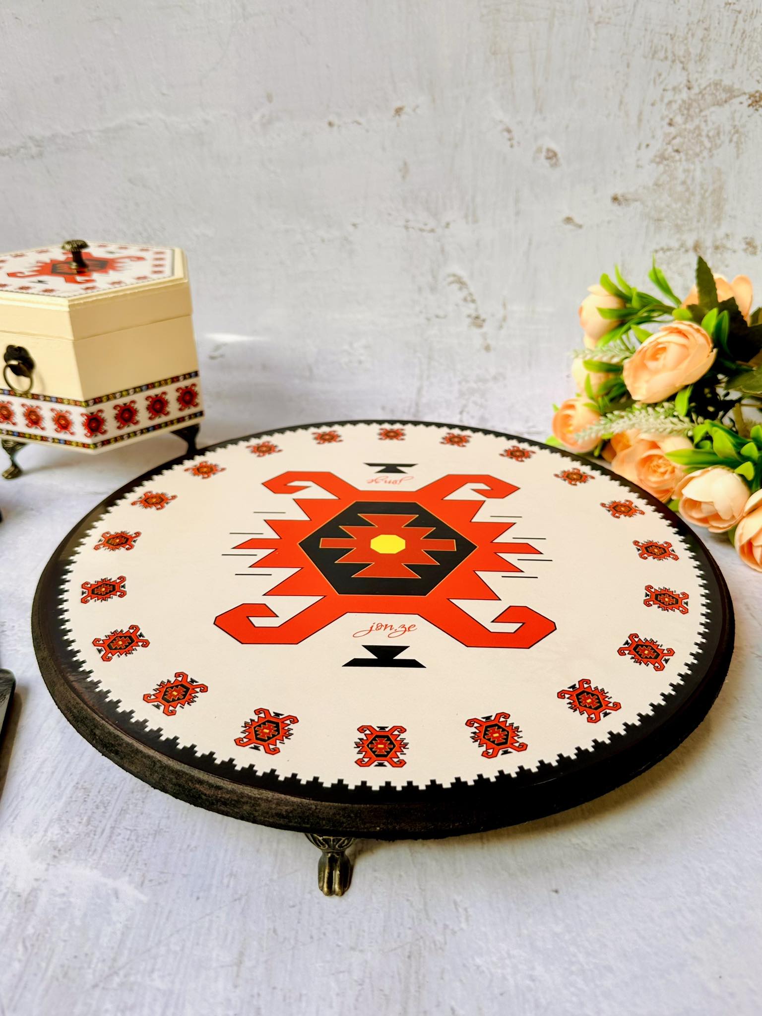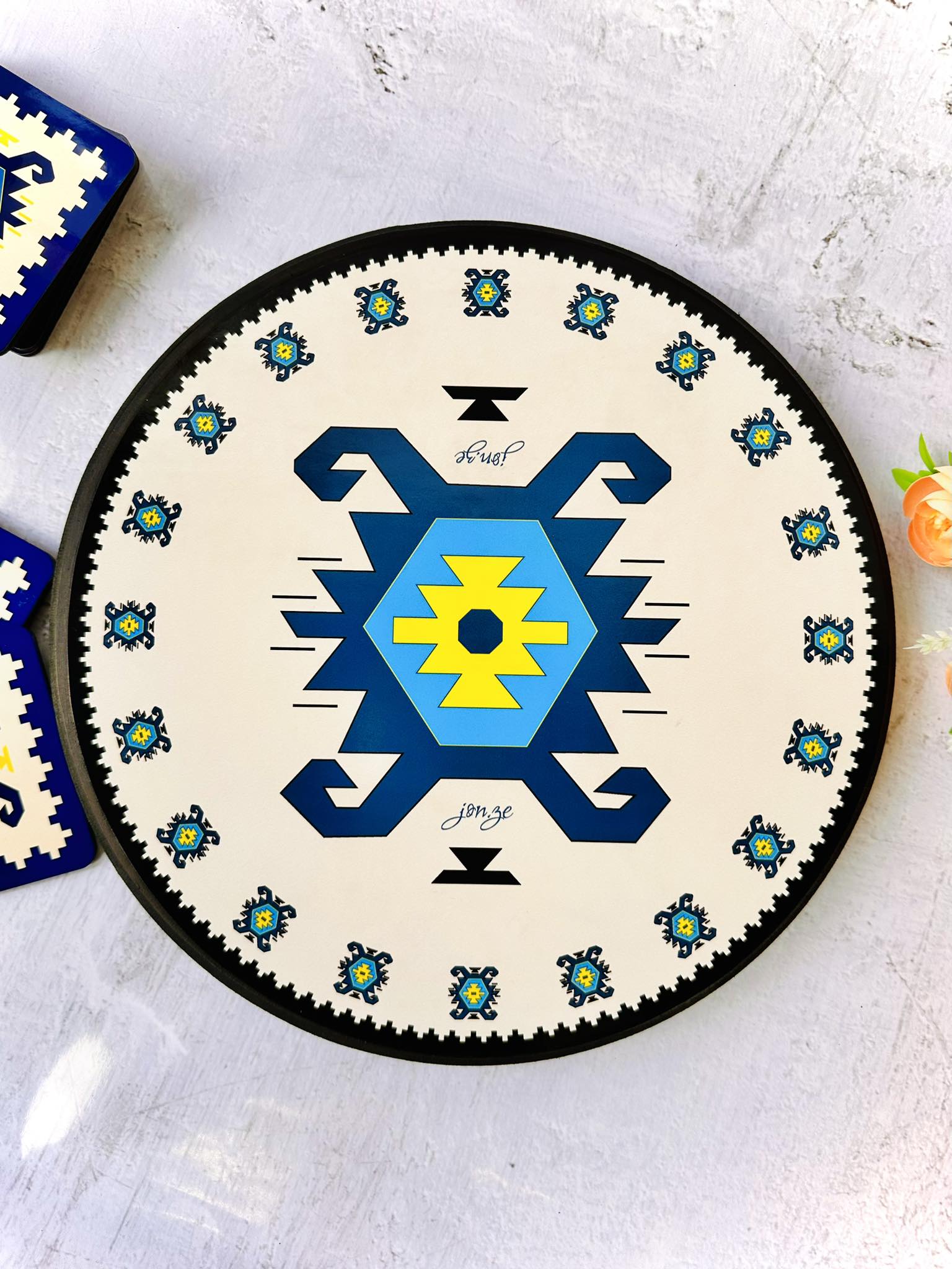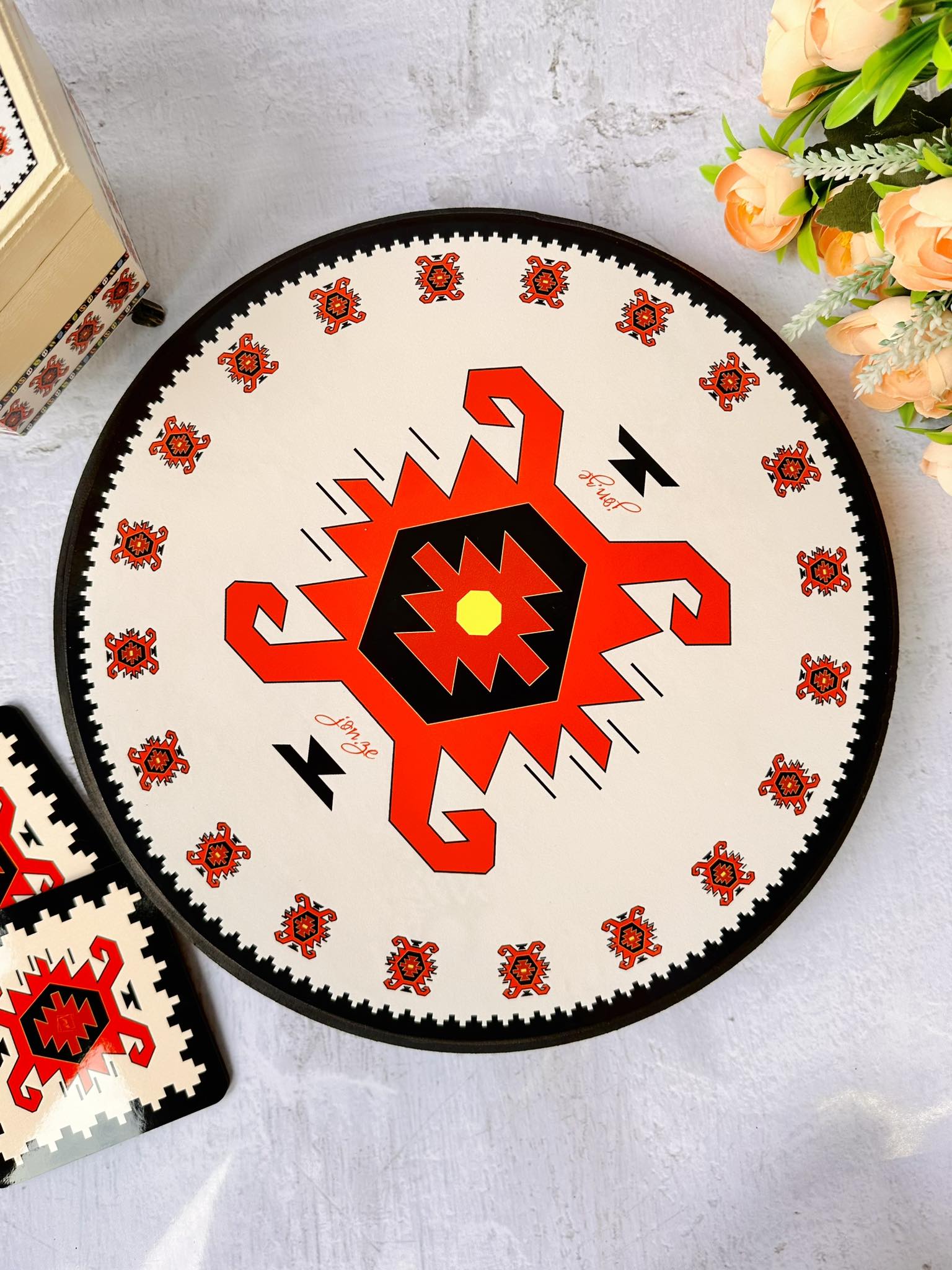 📦 Ambalaža: Svaka sinija dolazi upakovana u elegantnu crnu kutiju na čijoj sredini se nalazi mali otvor u obliku kruga kroz koji se nazire dezen ćilima i čini otvaranje poklona još uzbudljivijim.