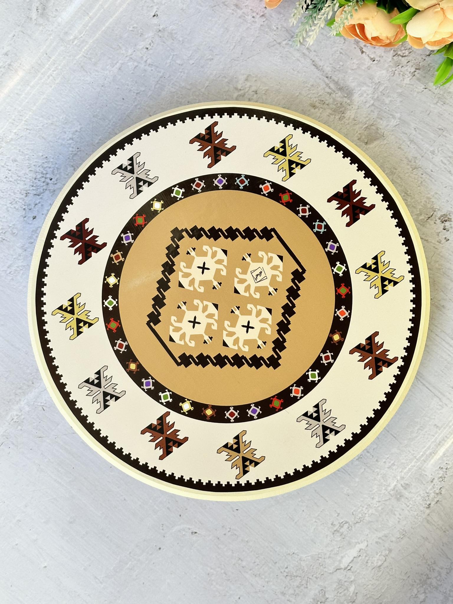 Sinija (tur.) je okrugli sto sa niskim nogama oko kojeg su se ljudi okupljaju kako bi razgovarali i objedovali. Na siniji su se također pravile pite, kao i druga tradicionalna jela. Ona je jedan od najznačajnijih simbola bosanske tradicije, gostoprimstva i zajedništva.Ovo umjetničko djelo inspirisano bosanskim ćilimom definitivno će donijeti djelić Bosne u tvoj dom.